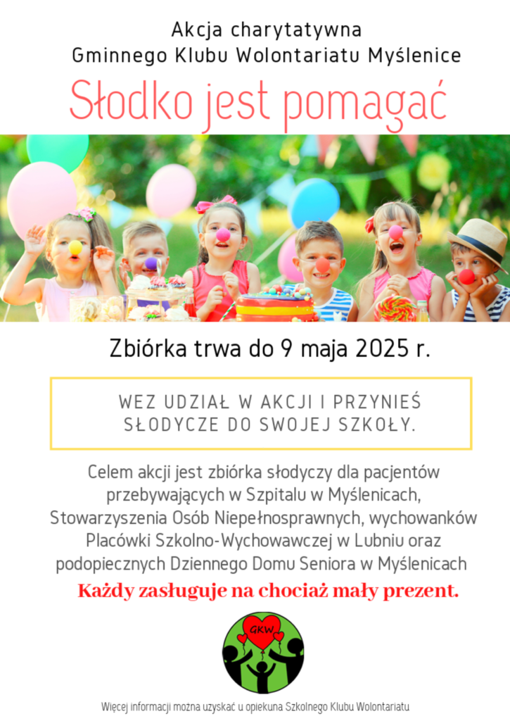 Zapraszamy do kolejnej akcji, którą organizuje Szkolne Koło Wolontariatu we współpracy z Gminnym Klubem Wolontariatu Myślenice. Celem akcji jest zbiórka słodyczy dla pacjentów SPZOZ w Myślenicach, Stowarzyszenia Osób Niepełnosprawnych, wychowanków Placówki Opiekuńczo- Wychowawczej w Lubniu oraz podopiecznych Dziennego Domu Seniora w Myślenicach z okazji Dnia Matki i Dnia Dziecka.